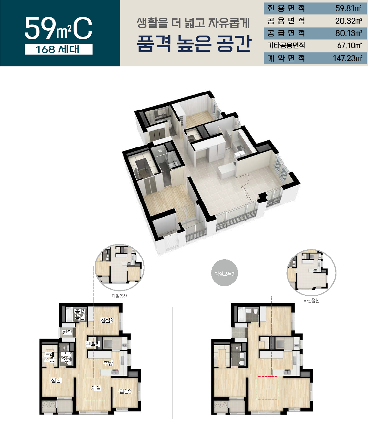 ※ 견본주택 내 마감재(위성기기, 조명, 전자제품 및 PL창호 등)는 본 공사 시 동급이상의 제품으로 변경하여 시공될 수 있습니다.
